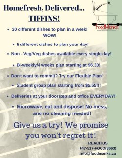 Food Monks is Toronto's premium food-commerce tiffin service which allows you to order delicious home-style food. You can order as many days in a week even if you are looking for one day a week. We offer both lunch and dinner from Monday to Saturday."